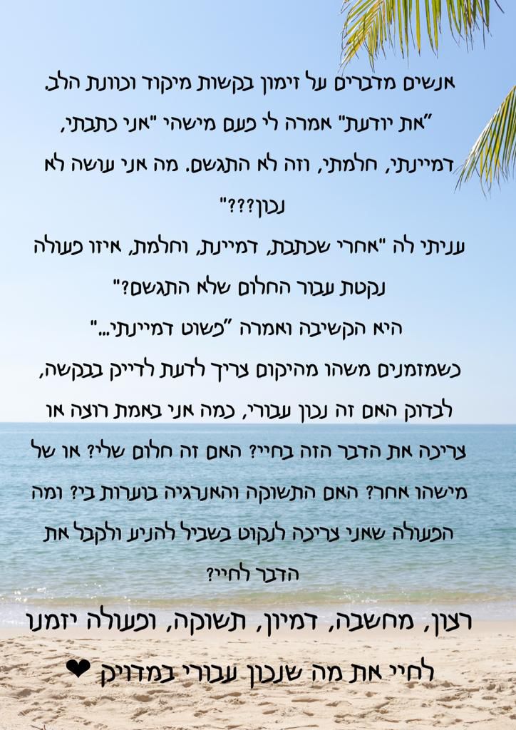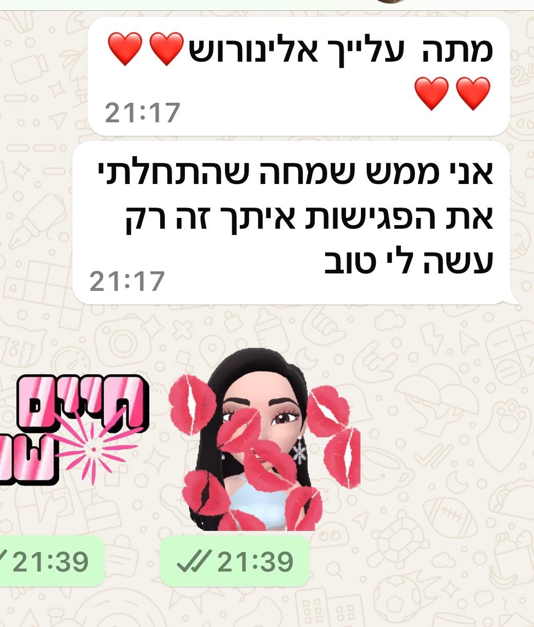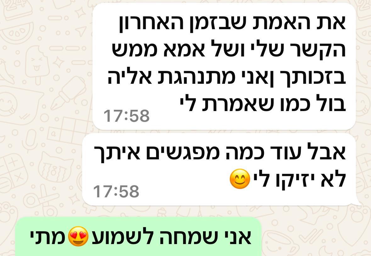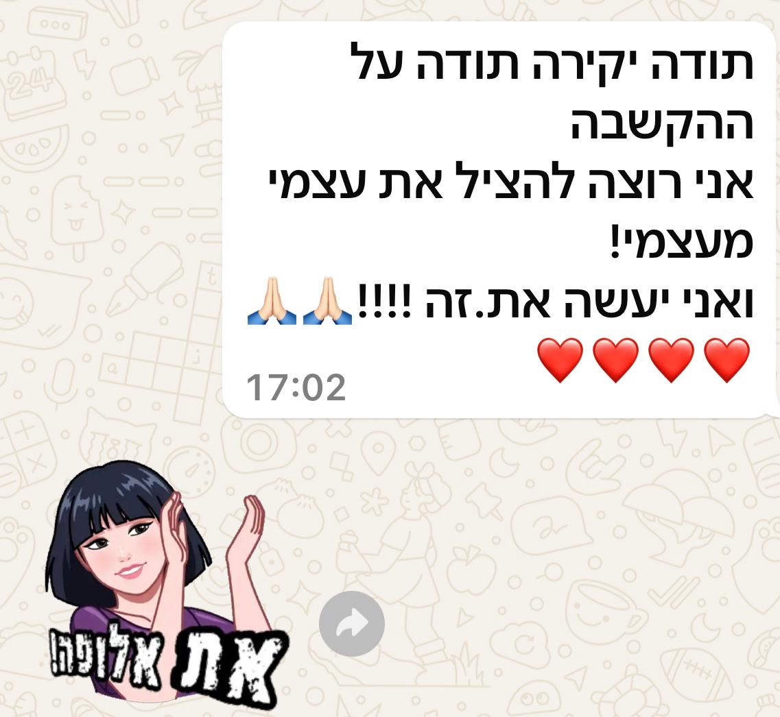 יחד נוכל להגיע לדיוק בחיים,לשפר מערכות יחסים ולהביא לידי ביטוי את הפוטנציאל הגלום בכל אחד ואחת מכם. הדרך להגשמה עצמית, להרגיש שלמים יותר ולהפוך את האתגרים להזדמנויות לצמיחה רגשית גשמית ורוחנית.
