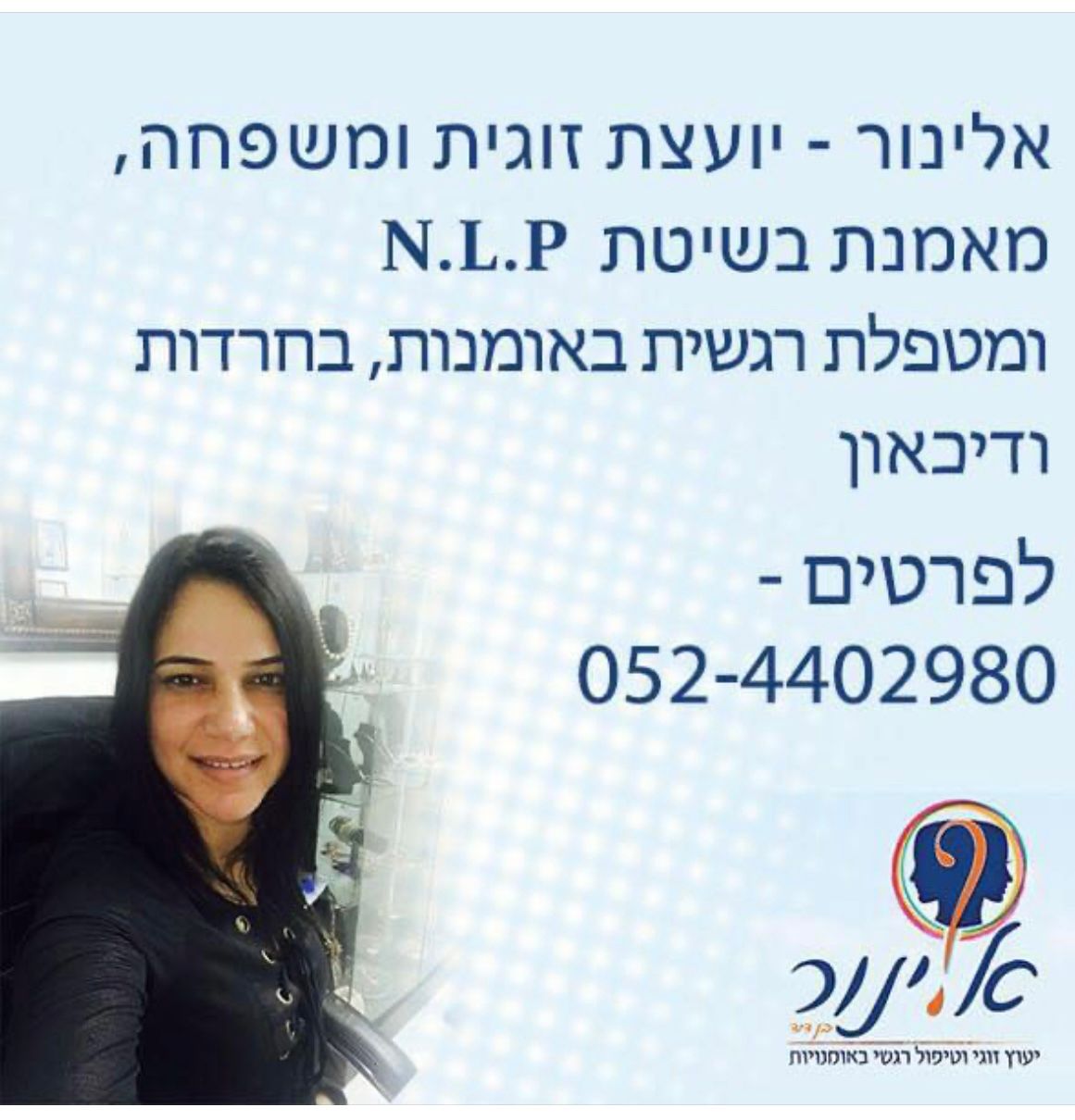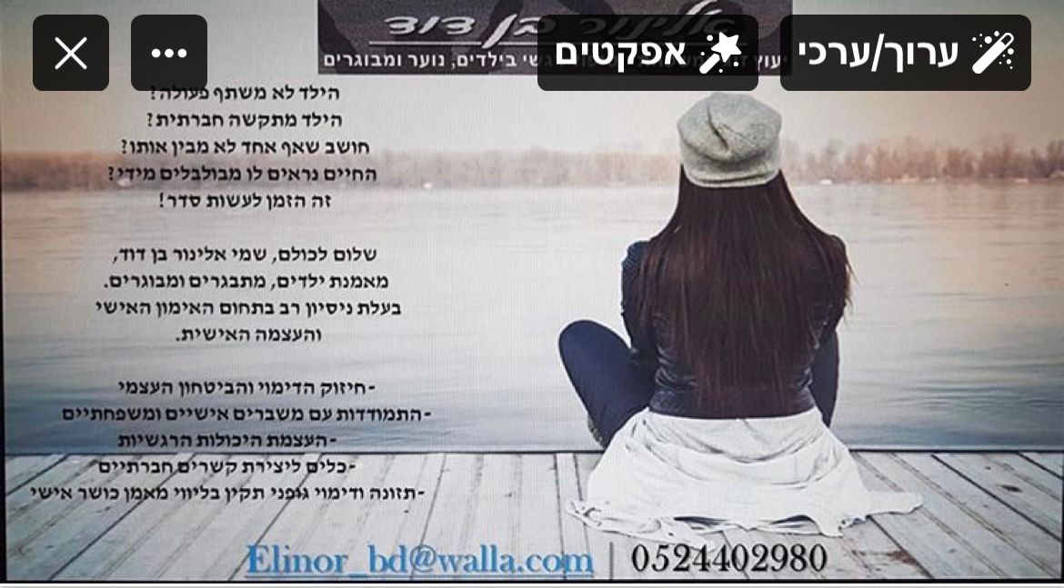 אלינורה בן דוד, יועצת זוגית ומשפחה מטעם האגודה הישראלית ליעוץ, מטפלת ומאמנת רגשית המתמחה בעבודה עם ילדים,נוער ומבוגרים.באמצעות כלים טיפוליים NLP,תטא הילינג,אקסס בארס,טיפול קוגנטיבי, שיקום באומנות ועוד.